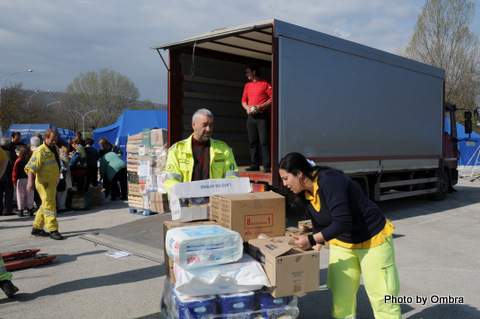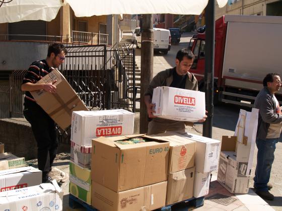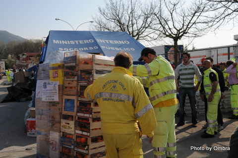 Rocco, Vincenzo e Giovanni sono giunti a destinazione. Stanno scaricando le merci al centro di raccolta degli aiuti provenienti dalla Basilicata.
